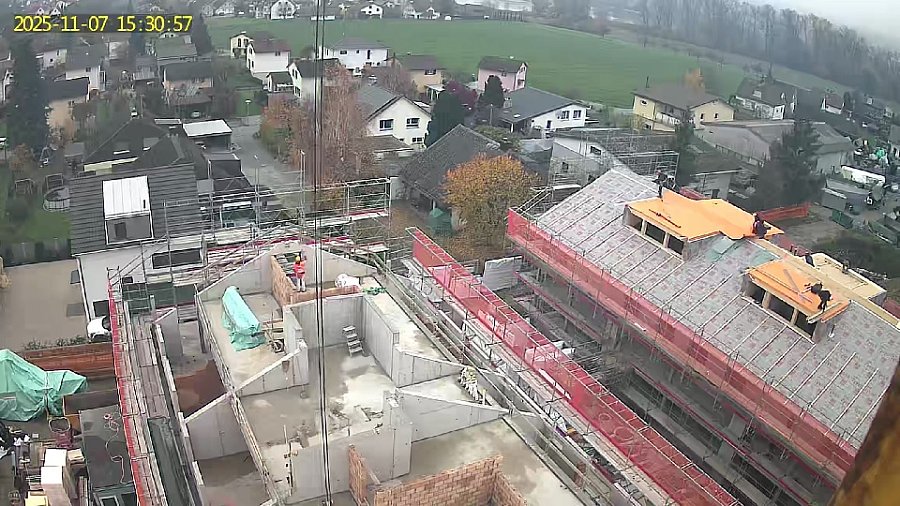 Seit dieser Woche montieren die Zimmermänner der Bantli AG die Dachelemente: Die ersten beiden Mehrfamilienhäuser sowie vier Einfamilienhäuser werden aktuell mit ihren Dächern versehen. Bereits in der kommenden Woche startet Team der Bantli AG mit der Fenstermontage – damit können die ersten Gebäudehüllen bald geschlossen werden.